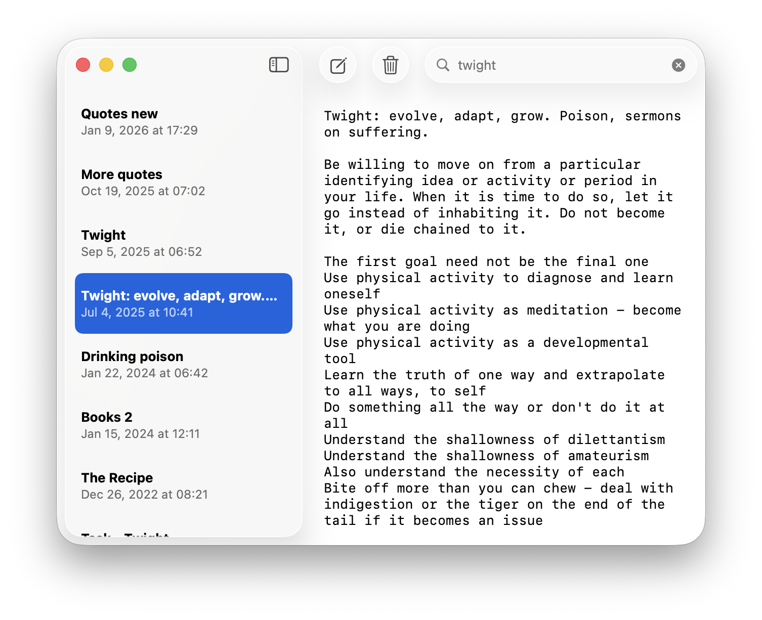 A minimalist note-taking companion designed for speed and clarity. Capture your thoughts instantly, search them effortlessly, and keep your focus where it matters most.