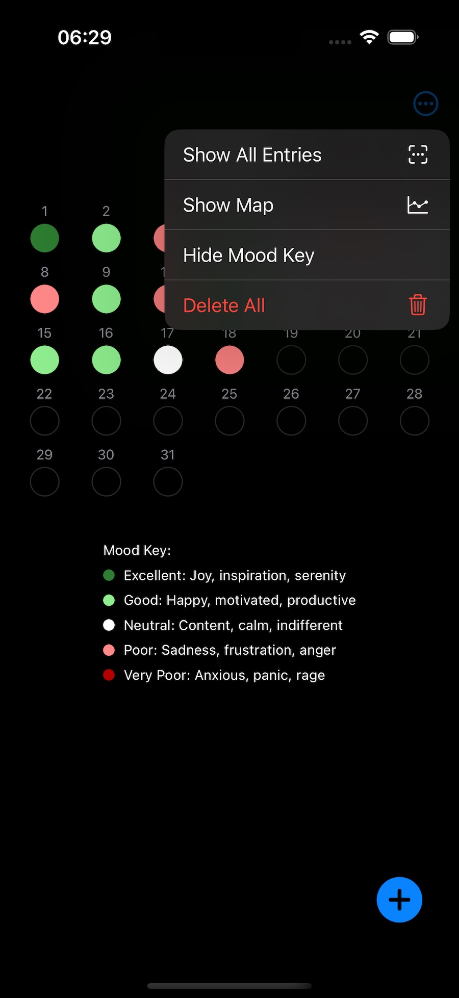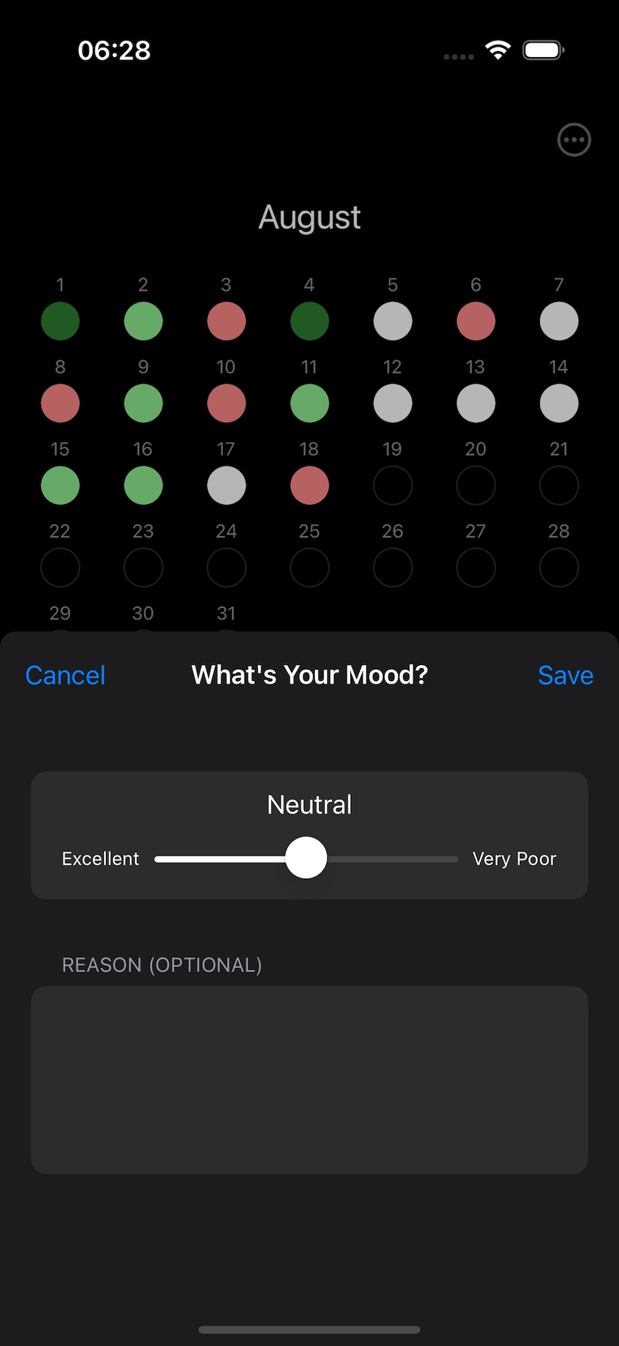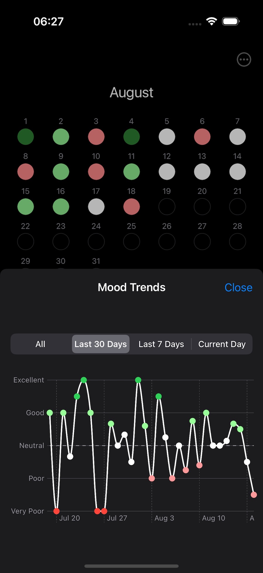 You can log new moods along with an optional reason, which will be shown on a mood map. If more than one mood is recorded, the average mood for the day is calculated. Mood trends can be tracked daily, weekly, monthly, and overall through a chart that highlights patterns and spikes.